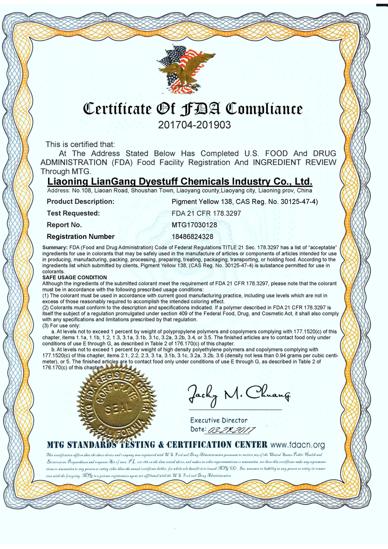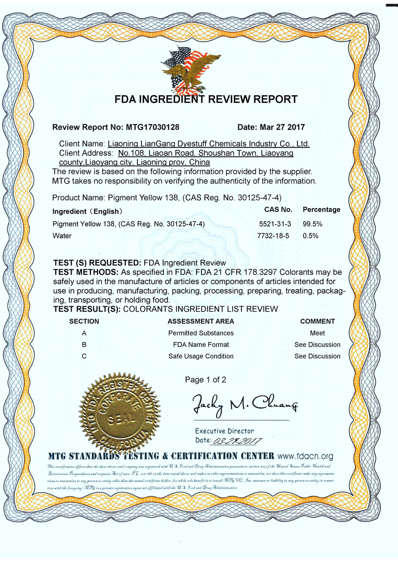 Pigment Yellow 138 has passed FDA authentication.