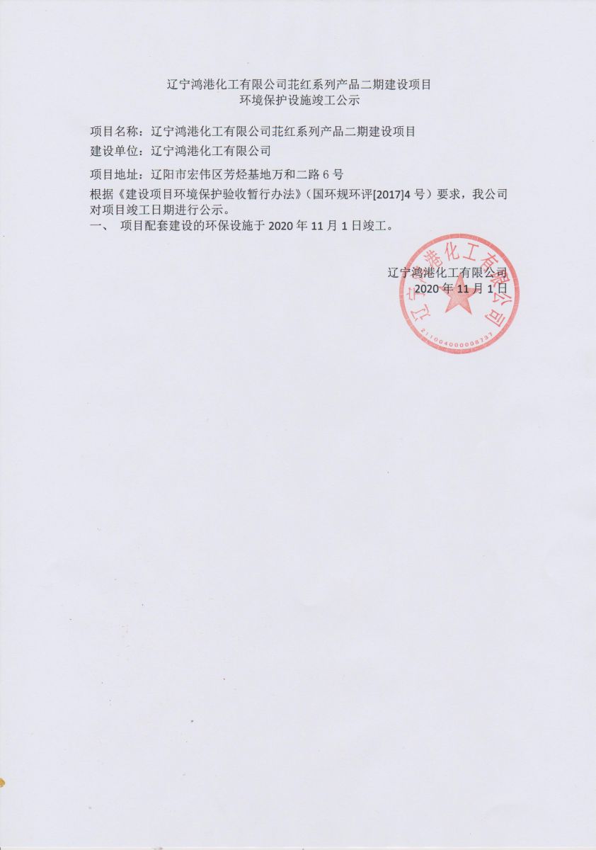 遼寧鴻港化工有限公司苝紅系列產(chǎn)品二期建設(shè)項目 環(huán)境保護設(shè)施竣工公示