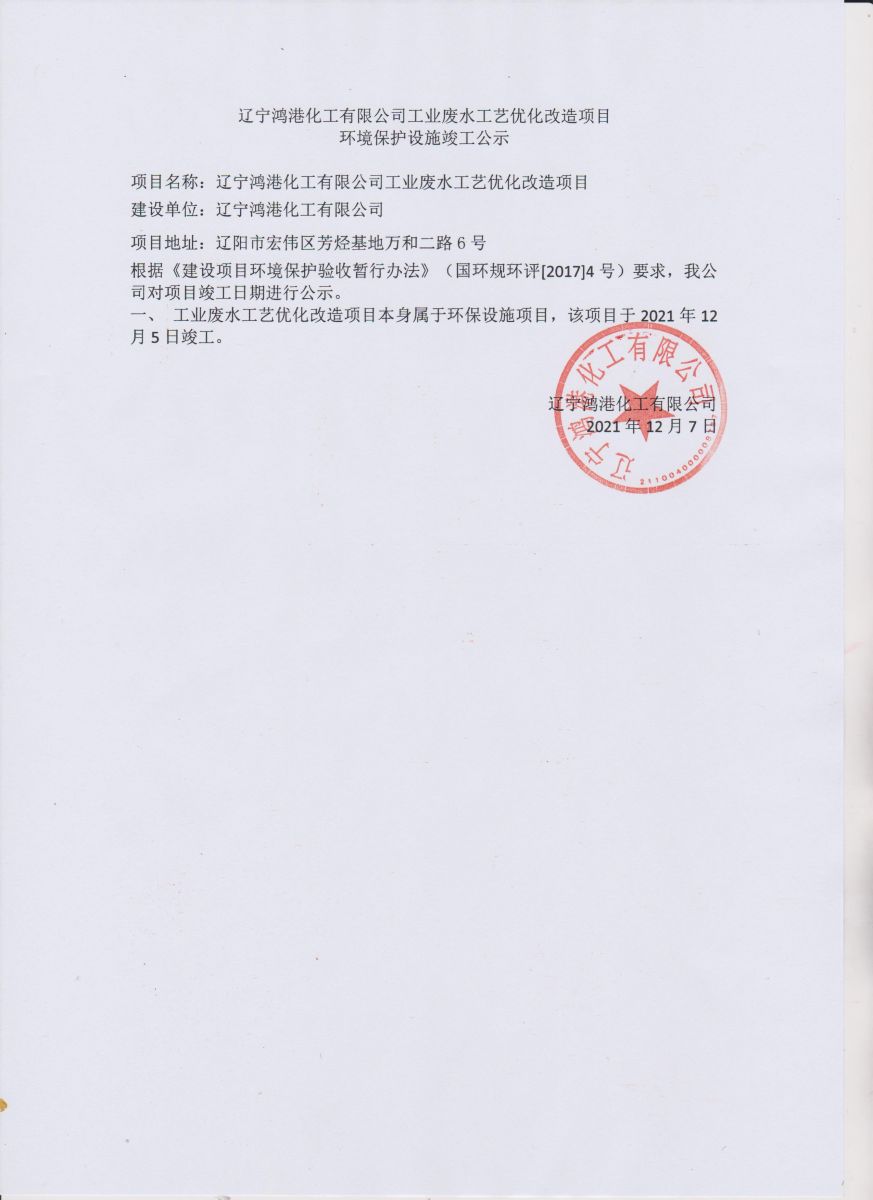 遼寧鴻港化工有限公司工業(yè)廢水工藝優(yōu)化改造項目環(huán)境保護設施竣工公示